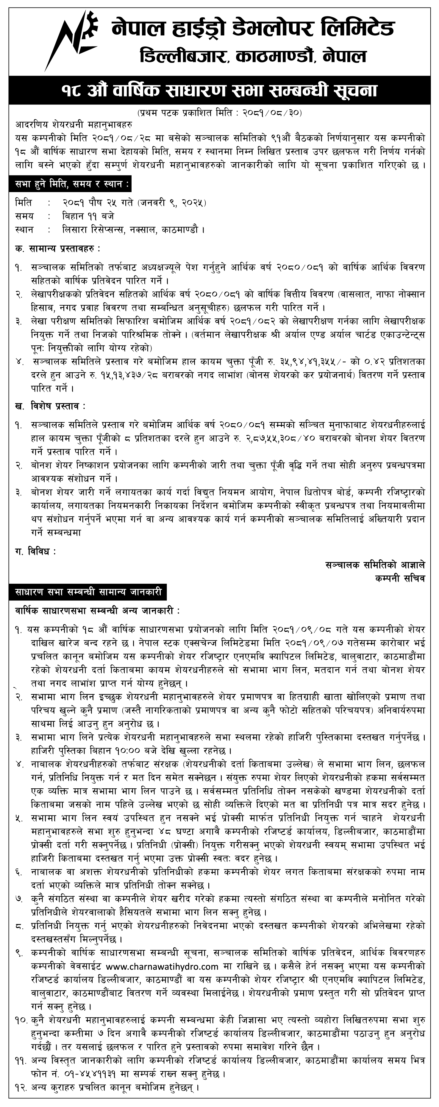 यस नेपाल हाइड्रो डेभलोपर लिमिटेडको आज मिति २०७५ पौष ९ गते सोमवार विहान ११.३० बजे बसेको संचालक समितिको बैठकले बोनस शेयर र नगद लाभाशं सम्बन्धि ...